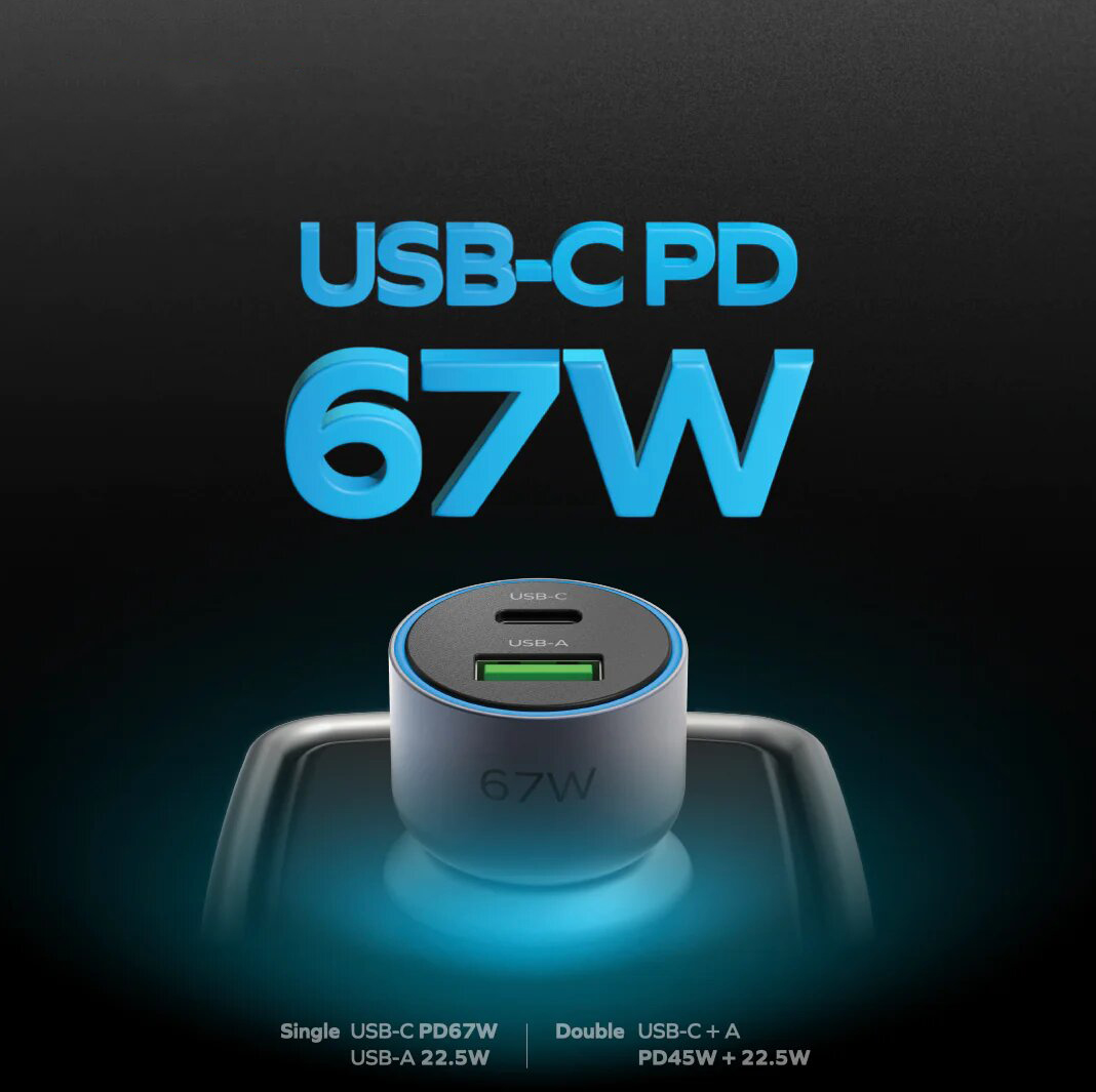 شاحن UC16 مزود بمنفذي USB-C وUSB-A بقدرة إخراج عالية تبلغ 67 واط، مما يسمح بشحن أي جهاز إلكتروني في آنٍ واحد. يضمن سبائك الألومنيوم مظهرًا مثاليًا ومتانة فائقة. يمكنك شحن الكمبيوتر المحمول في سيارتك.شحن جهازين في وقت واحد