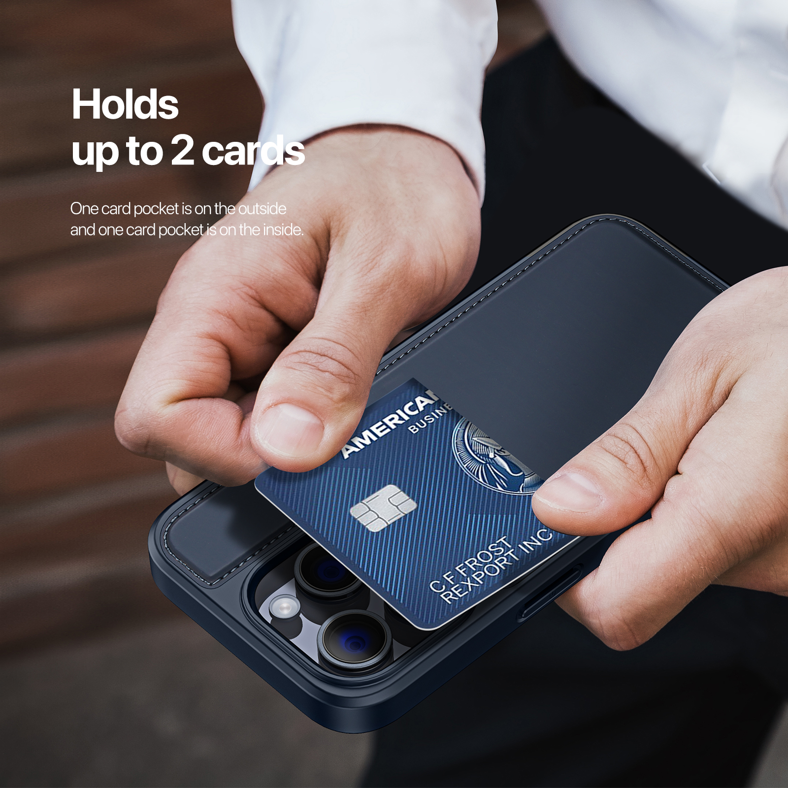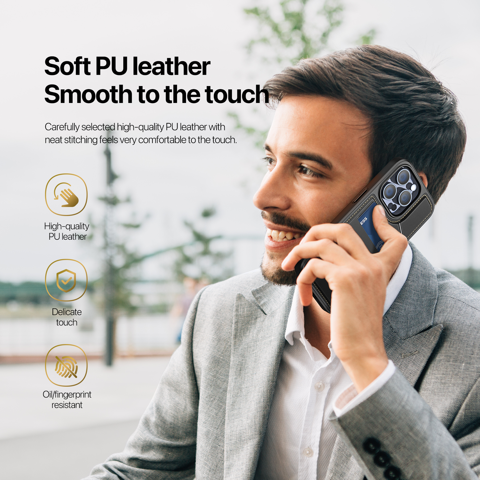 جراب مريح للإمساك به بفضل إطاره المُحسّن. ظهره مُغطى بطبقة من جلد البولي يوريثان الناعم. يحتوي على حاملي بطاقات، أحدهما خارجي والآخر داخلي، والداخلي مزود بخاصية الحماية من السرقة.